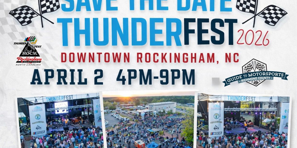 The pre-race celebration, ThunderFest, returns to downtown Rockingham around Harrington Square on Thursday, April 2, from 4PM-9PM ahead of the NASCAR trio of races at Rockingham Speedway on Friday, April 3, with the Black's Tire 200 NASCAR CRAFTSMAN Truck Series race and the ARCA Menards Series East and North Carolina Education Lottery 250 Presented by Black's Tire NASCAR O'Reilly Auto Parts races on Saturday. See more details and purchase tickets on www.racetherock.com.